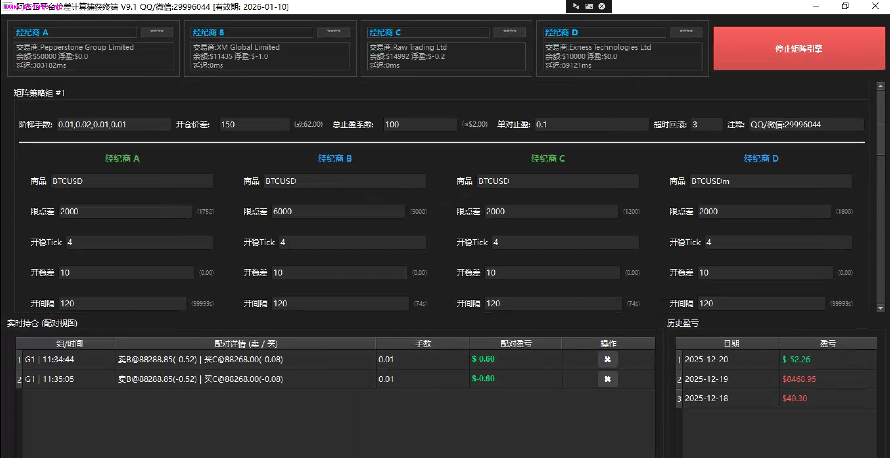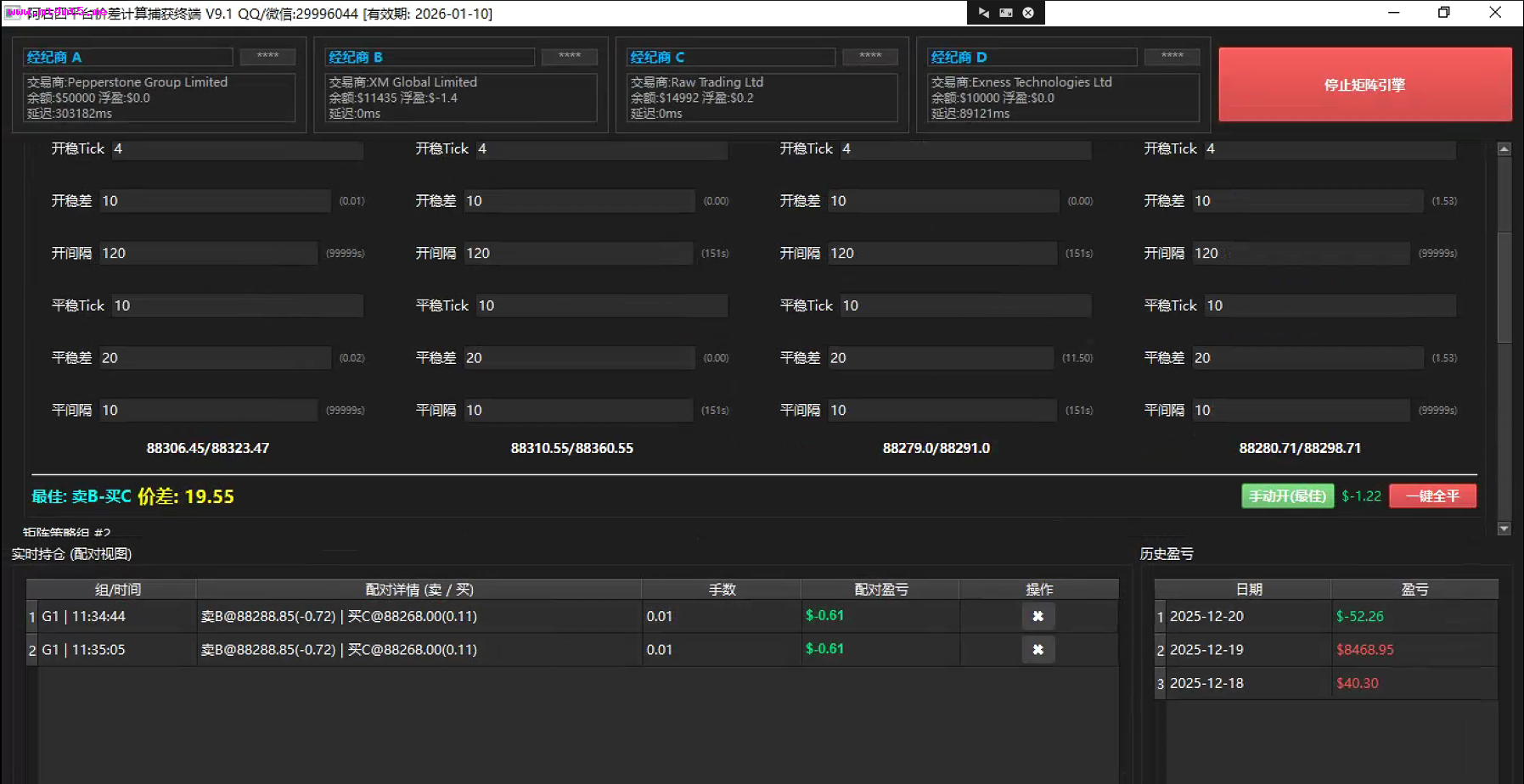 让两家经纪商为你打工!MT4/MT5全自动跨平台点差价差对冲套利终端,毫秒级“搬砖”收割机。 0.0001秒级捕捉:价差刚出现,订单已成交,快过99%的交易员真·零风险:双向对冲,不赌方向,只赚报价差异的"确定性"利润 躺赚模式:24小时自动监控,你睡觉,它搬砖,睡醒收Dollar 傻瓜式操作:装完软件,设置参数,一键启动,无需盯盘手工套利?慢!滑点!情绪干扰!机会流失!我们的软件 = 速度护城河 + 纪律机器 + 永不停歇的劳工 真实案例:"昨晚XAUUSD价差偏离200个点,软件自动在A平台卖、B平台买,持仓3分钟,扣除成本净赚120$。我全程在刷Dou音。" 适合谁?厌恶风险的保守型交易者 想解放时间的躺平派有多个账户的资管人 追求稳定现金流的聪明钱"现在下单,今晚就让机器人给你打工!"合规提示:本工具仅加速人工操作,不修改数据、不违规交易。收益取决于市场价差频率,过往表现不代表未来。建议先用模拟盘测试。视频教程演示:【阿右四平台价差捕获计算终端V9.1 震撼升级】智能风控再进化,铸就交易护城河 「动态平衡守护系统」行业首创订单共生机制,配对订单如双生镜像,任一订单因市场极端波动或异常状况触发平仓,另一委托将毫秒级智能联动,自动执行同步平仓,彻底杜绝单边敞口风险,让您的套利组合始终处于完美对冲状态。「时间熔断防护机制」针对平台延迟卡盘顽疾,自主研发超时智能回滚引擎。当单边成交超过预设时间阈值(可自定义秒级精度,设0即静默模式),系统将自动启动风险干预程序,瞬时完成另一侧委托的优雅退出,将流动性风险扼杀于毫秒之间。「镜像盈亏可视化座舱」重构持仓监控维度,首创配对矩阵视图。每一对套利订单以孪生形态立体呈现,实时盈亏一目了然;支持精准点选任意组合,一键触发双线程同步平仓,人机协同效率跃升300%,掌控感从未如此直观。「单对智能止盈矩阵」突破传统组合止盈局限,引入单对订单独立盈利系数阈值。当任意配对单元触及预设盈利目标,即刻激活独立平仓指令,实现"盈利颗粒度"精细化管理,让利润收割更加灵活犀利,不错过每一次局部最优解。V9.1不止于升级,更是对您交易掌控力的全方位赋能。请各位老板联系我升级配置文件。