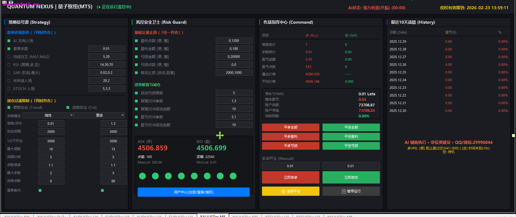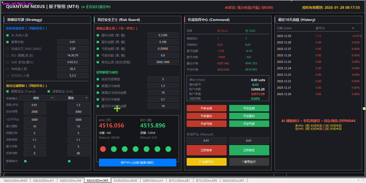 QUANTUM NEXUS|量子枢纽EA(MT4/MT5)发布全自动 AI 量化交易中枢 · 24H 智能监控运行中界面截图:【策略信号源 Strategy Engine】多维共振 · 精准出手 · 只做高确定性行情 划时代·真AI·云端交易革命 ✨ 【颠覆性科技】真正的AI数据模型驱动 —— 非伪智能,非简单算法!百亿级神经元在云端7×24小时为您而战,您的电脑只是发布王令的权杖,不是烧机的矿工 AI 趋势智能识别深度解析市场主方向,过滤无效波动非追涨杀跌,只介入结构性机会 多指标量子共振确认MA 趋势结构RSI 多周期强弱判断SAR 阶段拐点捕捉STOCH 动量同步验证 多条件同时满足才允许开仓,拒绝情绪交易 智能入场模块单笔精准建仓绝不盲目频繁交易专为震荡与趋势行情优化【加仓与追踪系统 Position Booster】让利润奔跑,而不是让风险失控 顺势智能加仓(Trend Boost)利润确认后才加仓趋势越强,收益释放越充分逆势防御型加仓(Control Grid)非马丁乱加所有加仓均纳入风险模型 动态仓位演算引擎手数自动缩放仓位层级清晰杜绝“一口气把账户干没”【风险安全卫士 Risk Guard】不是“能赚”,而是“能活得久”基础止损体系(硬防线)单笔最大风险锁定盈亏比结构化控制 智能浮动保护(软防线)盈利自动保护回撤实时压制逆向容错机制市场异常自动降频极端行情主动收缩仓位 目标只有一个:回撤可控,账户可持续增长【作战指挥中心 Command Center】所有仓位,一屏掌控 多 / 空 实时作战态势持仓数量成本均价盈亏结构净头寸一目了然一键级指令系统全部平多 全部平空智能锁盈 紧急止损 手动 & AI 双模控制人工干预随时接管AI 执行毫秒级响应【历史战绩回溯 History Log】每一笔交易,都经得起回看 10 日滚动绩效统计日盈亏透明展示收益率完整记录拒绝“截图收益”不修图不挑日子不隐藏回撤真实曲线,比任何承诺都有说服力【AI 智能辅助系统】不是“托管”,而是“智能执行官”7×24 小时行情扫描自动过滤低质量信号 严格执行既定交易纪律 QUANTUM NEXUS|量子枢纽EA 不是单一策略,而是模块化量化系统 不是高频赌博,而是概率优势叠加 不是暴利幻想,而是长期生存模型 QUANTUM NEXUS|量子枢纽EA用系统对抗情绪用规则对抗人性用科技换取稳定性免费下载:QUANTUMNEXUS量子枢纽EAMT4测试版QUANTUMNEXUS量子枢纽EAMT5测试版